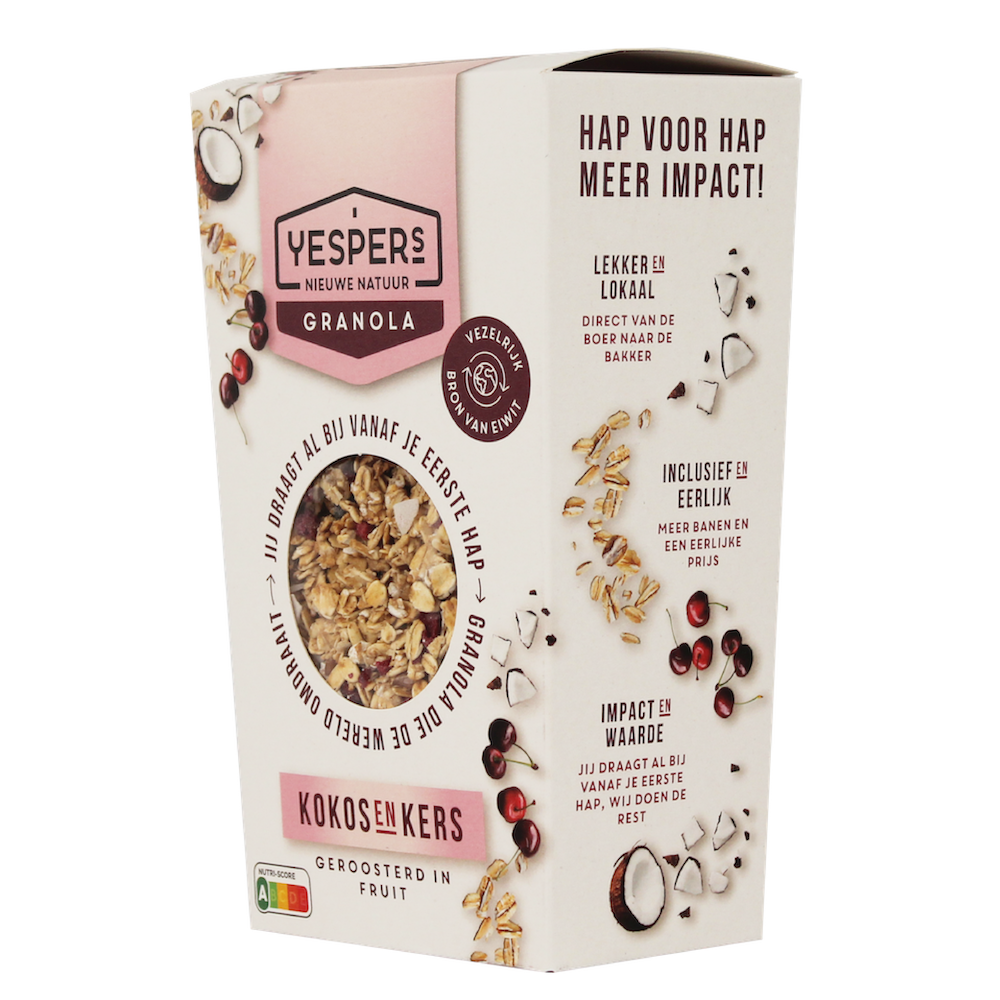 De granola Kokos en Kers onderscheidt zich door de heerlijke tropische combinatie met de heerlijke Nederlandse haver.