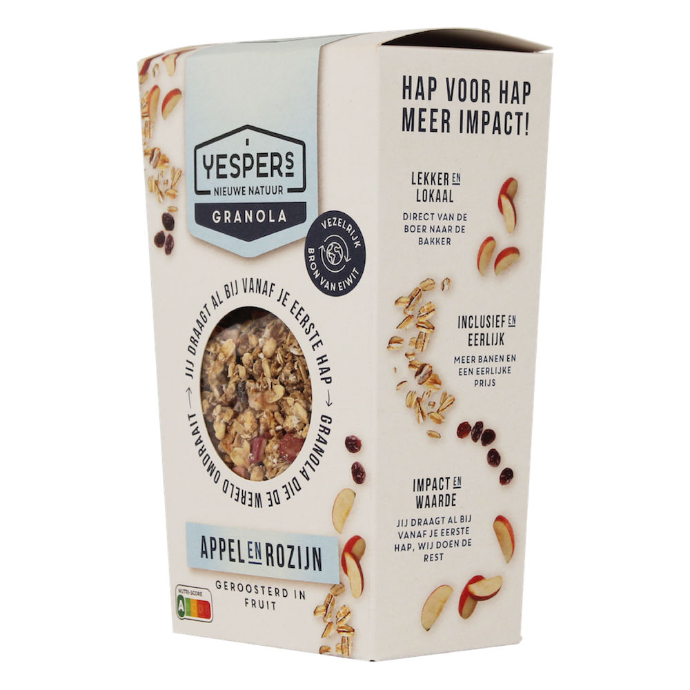 De granola Appel en Rozijn onderscheidt zich doordat de appels volledig worden benut in onze appel fabriek.